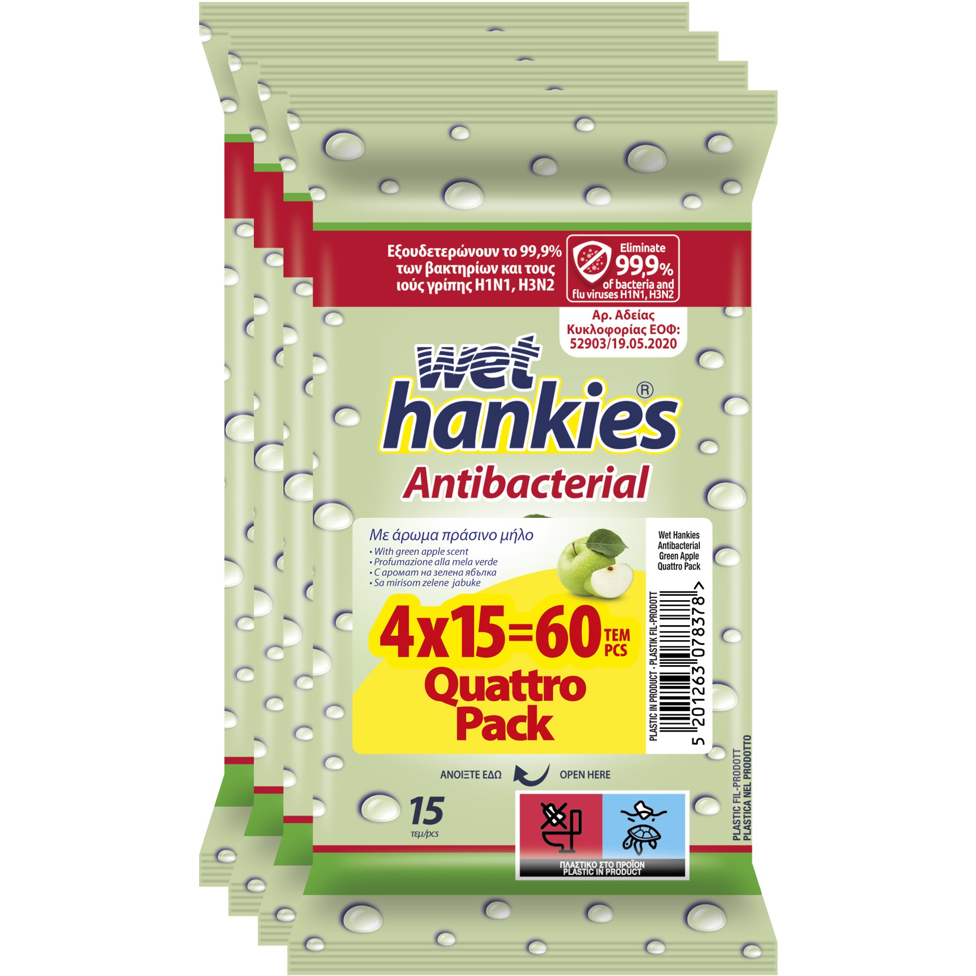 WET HANKIES ΥΓΡΑ ΜΑΝΤΗΛΑΚΙΑ ΑΝΤΙΒΑΚΤΗΡΙΑΚΑ ΜΗΛΟ 15τεμ (4X15 QUATTRO PACK) *